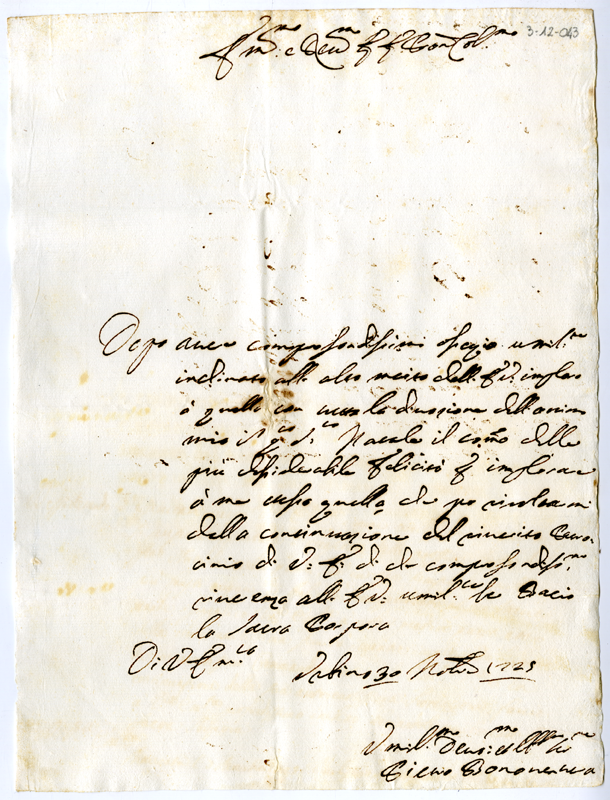 Lettera di Pietro Bonaventura al cardinale Annibale Albani (1725 dicembre 30)