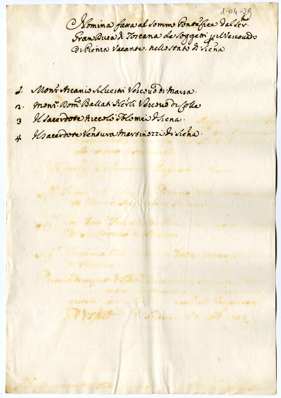Nomina fatta al sommo Pontefice dal rev. Gran Duca di Toscana de soggetti per il vescovado di Pienza vacante nello stato di Siena