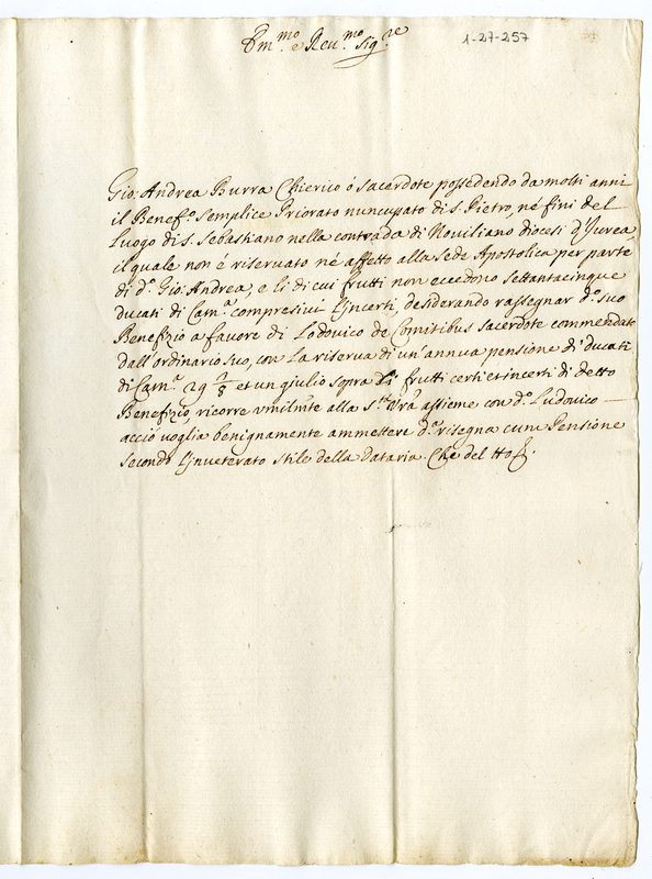 Burra Giovanni Andrea chiede di rinunciare al suo beneficio sotto il nome di San Pietro nella diocesi di Ivrea a favore di Ludovico de Cornitibus