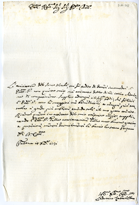 Lettera di Lodovico Zabarella al cardinale Annibale Albani (1731 dicembre 14)