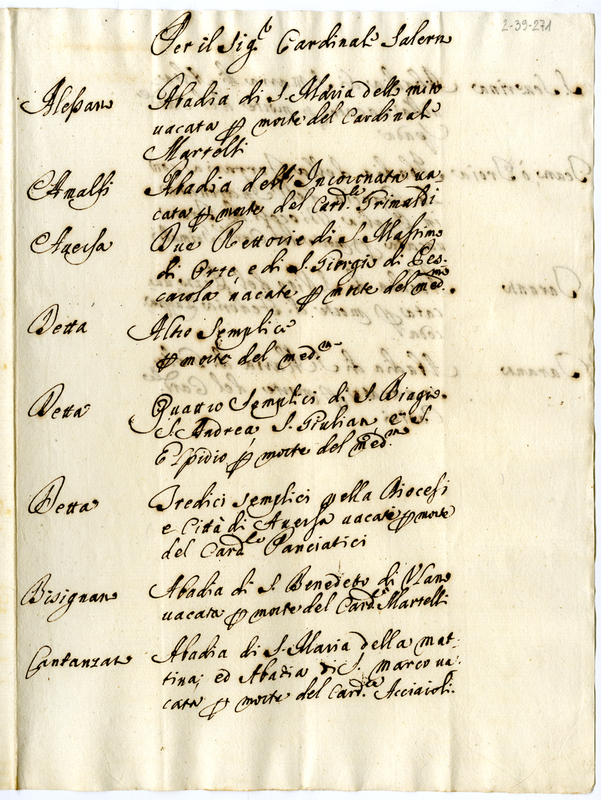 Per il Signor Cardinale Salerno (1719-1721)
