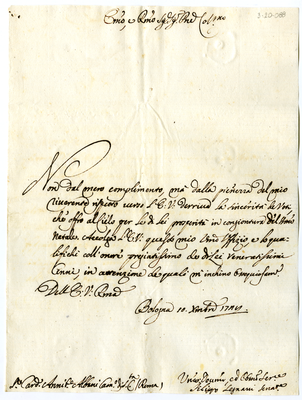 Lettera di Filippo Legnani al cardinale Annibale Albani (1728 dicembre 10)