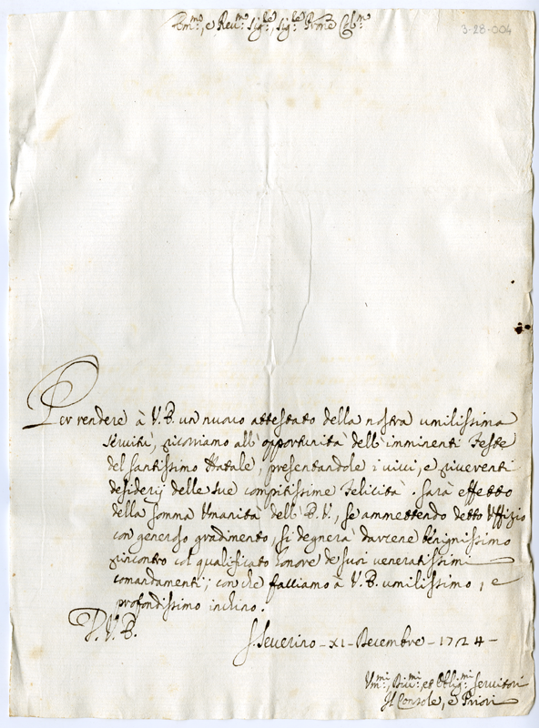 Lettera del console e priori della città di San Severino al cardinale Annibale Albani (1724 dicembre 11)