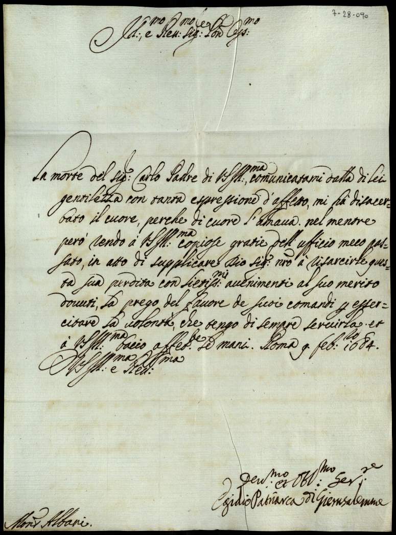 Lettere di personaggi scritte a Monsignor Albani in condoglianza della morte del Signor Carlo suo padre