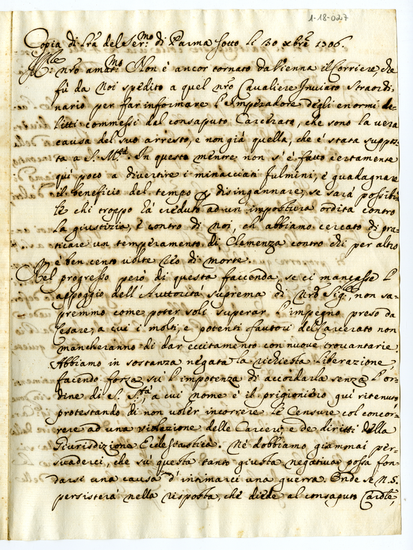 Copia di lettera del serenissimo duca di Parma (1706 dicembre 30)