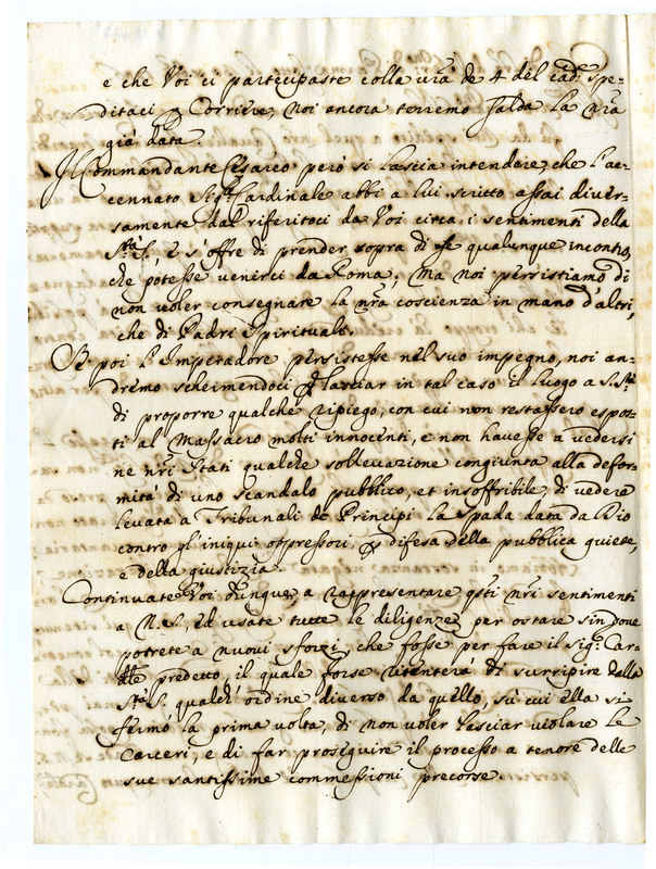 Comunica al suo ambasciatore in Roma le difficoltà sorte da parte dell'imperatore a causa dell'imprigionamento del consaputo cavaliere (Felice Landi)