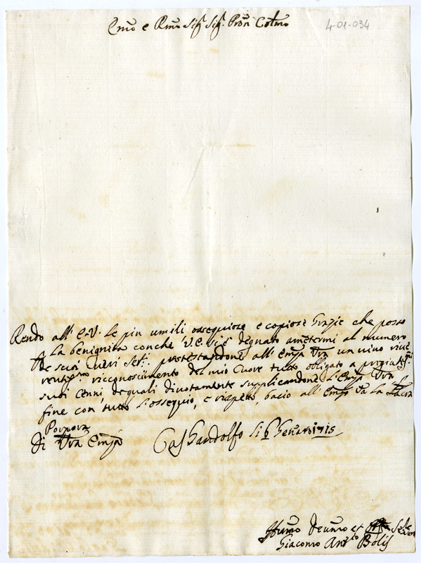 Lettera di Giacomo Antonio Bolis al Cardinale Annibale Albani (1715 gennaio 6)