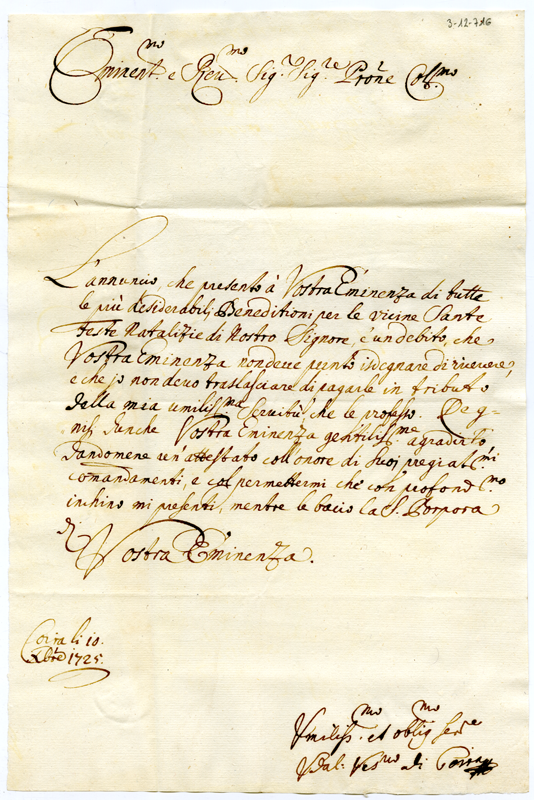 Lettera del vescovo di Coira al cardinale Annibale Albani (1725 dicembre 10)