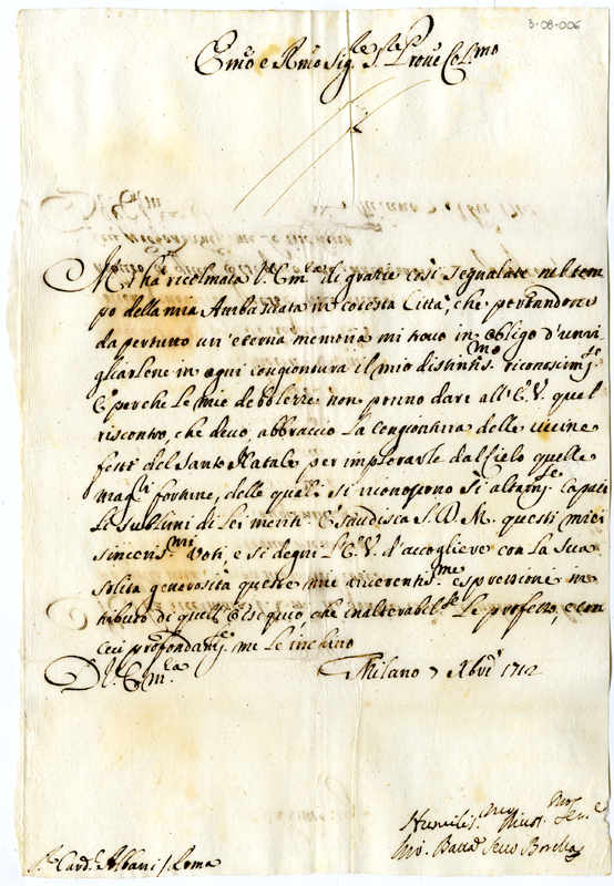 Lettera di Giovanni Battista Borella al cardinale Annibale Albani (1712 dicembre 7)