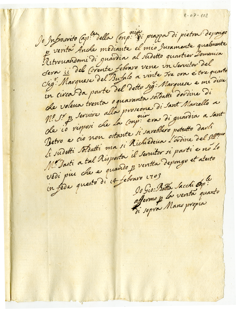 Deposizione del caporale Giovanni Battista Sacchi della compagnia di San Pietro sulla richiesta di un servitore del marchese Del Bufalo di 30 o 40 soldati per la processione di San Marcello, risposta negativa (1703 febbraio 14)