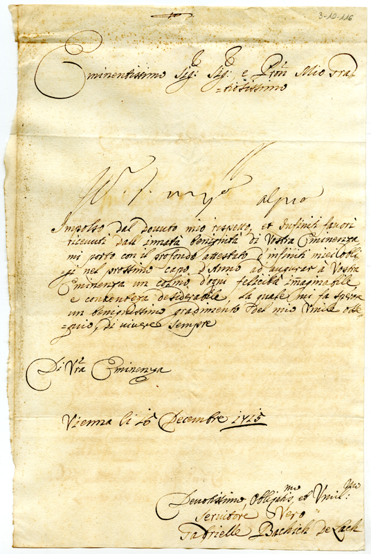 Lettera di Gabriele Bachich de Lach al cardinale Annibale Albani (1715 dicembre 15)