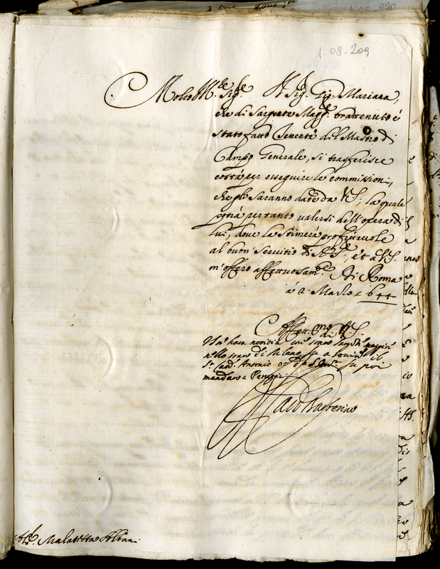 Il cardinale Barberini Francesco comunica a Malatesta che arriverà il tenente Mariana Giovanni e di valersi dell'opera di lui