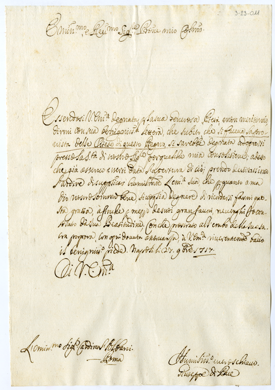 Lettera di Giuseppe di Pace al cardinale Annibale Albani (1717 novembre 27)