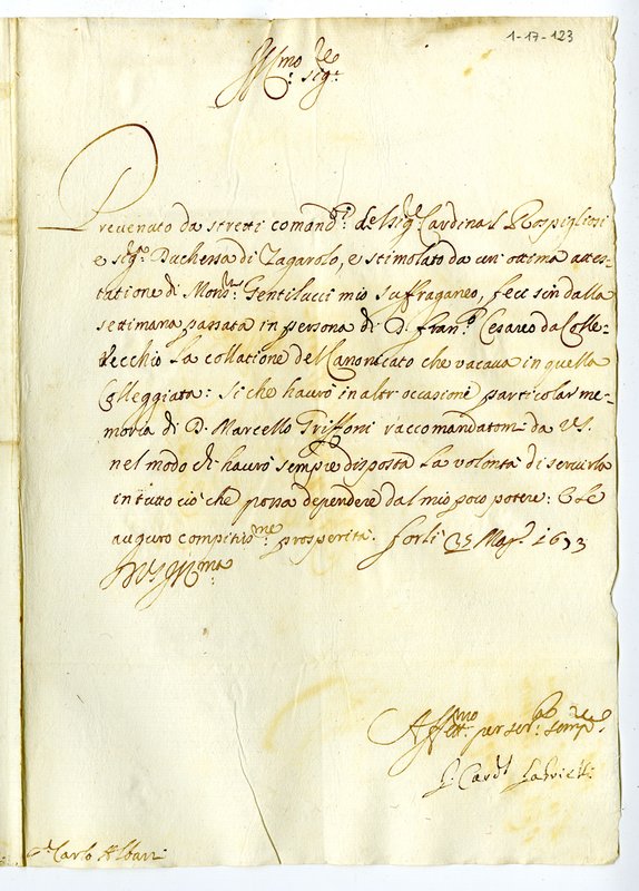 Lettera del cardinale Giulio Gabrielli a Carlo Albani (1673 maggio 25)