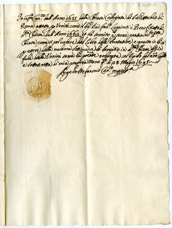 Attesta che don Francesco Lupicuti è beneficiario della Chiesa di Sant'Eustachio in Roma dal 1662