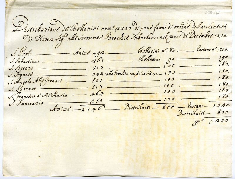 Distribuzione di bollettini numero 2240 di pane fatta per ordine della Santità di Nostro Signore alle sottocsritte parrocchie suburbane nel mese di dicembre 1720