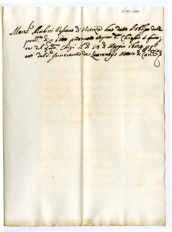 Promemoria sulla obbligazione assunta da monsignor Rubino vescovo di Vicenza per una pensione di 1100 scudi a favore del cardinale Chigi il 13 maggio 1684