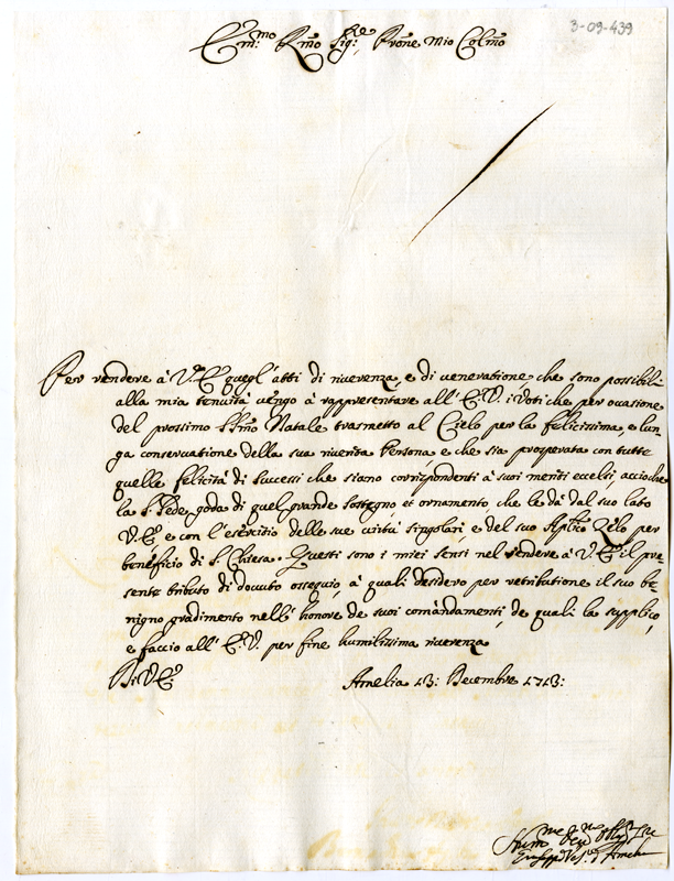 Lettera di Giuseppe vescovo di Amelia al cardinale Annibale Albani (1713 dicembre 13)