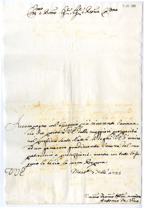 Lettera di Antonio De Vico al cardinale Annibale Albani (1725 dicembre 7)