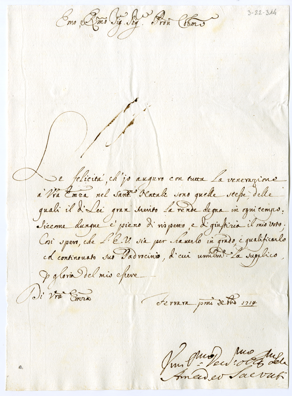 Lettera di Amedeo Sacrati al cardinale Annibale Albani (1714 dicembre 1)
