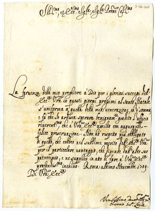 Lettera di Oronzio ... Lecce ad Annibale Albani (1709 novembre 30)