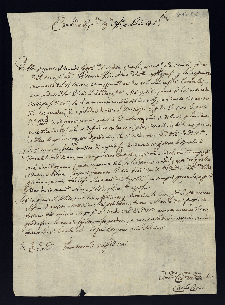 Lettere di condoglianza per la morte di Papa Clemente XI di gloriosa memoria