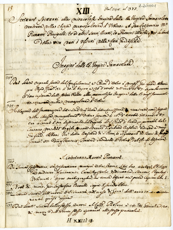 Scritture spettanti alla miracolosa immagine della Beata Vergine Immacolata venerata nella Chiesa Metropolitana d'Urbino. A San Crescentino Martire Protettore principale: et altri Santi, Beati, et Huomini illustri per la bontà della vita nati o vissuti nella città medesima