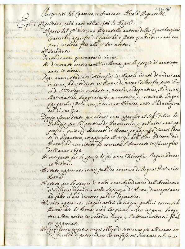 Requisiti del Canonico, et Avvocato Nicolò Pignatelli (1700-1721)