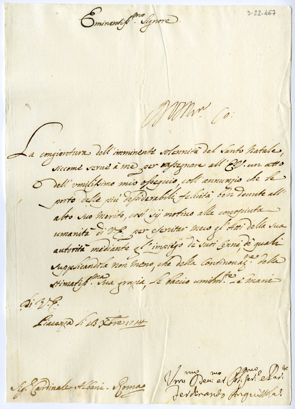 Lettera di Ferdinando Anguissola al cardinale Annibale Albani (1714 dicembre 13)
