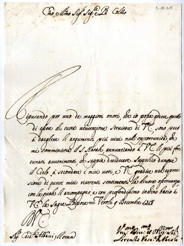 Lettera di Lorenzo vescovo di Veroli ad Annibale Albani (1718 dicembre 9)