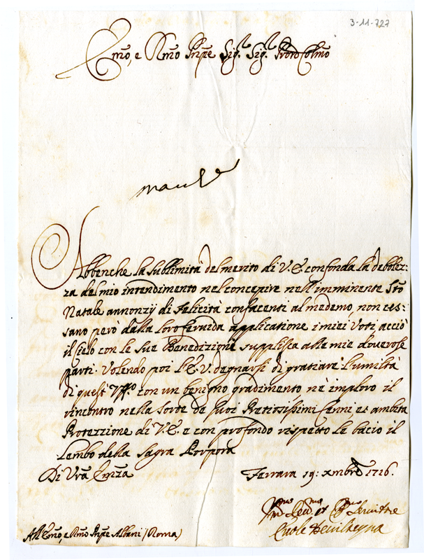 Lettera di Ercole Bevilacqua al cardinale Annibale Albani (1716 dicembre 19)
