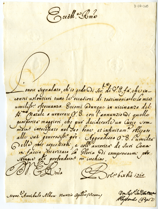 Lettera di Alessandro Pepoli ad Annibale Albani (1710 dicembre 6)