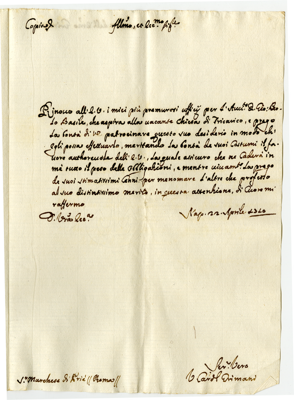 Lettera del cardinale Grimani al marchese di Priè. Copia (1710 aprile 22)