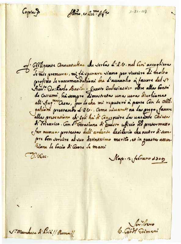 Lettera del cardinale Grimani al marchese di Priè. Copia (1710 aprile 22)