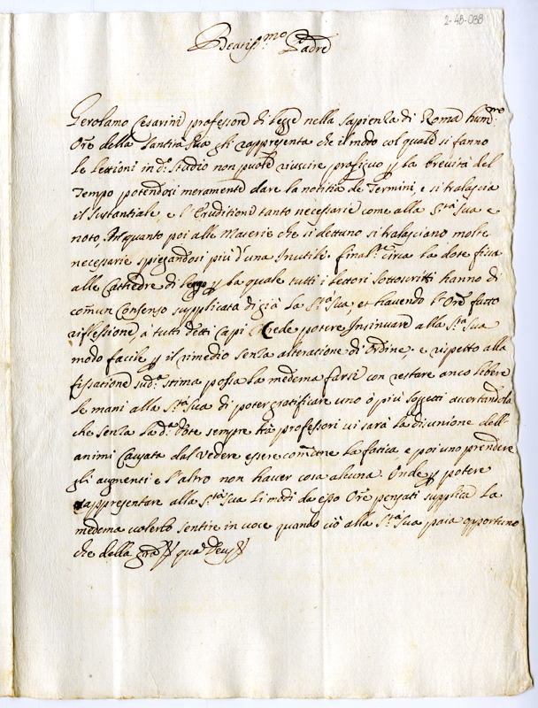 Lettera di Gerolamo Cesarini professore di legge alla Sapienza di Roma a papa Clemente XI (1700-1721)