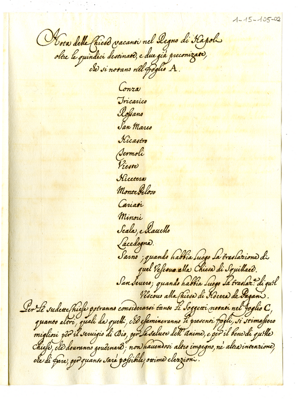 Nota delle chiese vacanti nel regno di Napoli altre le quindici destinate, e due già preconizate