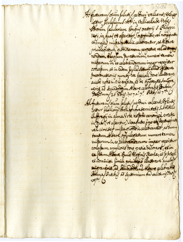 Concessione di un'altro altare privilegiato nella chiesa di Santa Maria in Vallicella in Roma e nella chiesa dell'Arciconfraternita del Suffragio in Roma (1707 ottobre 26)