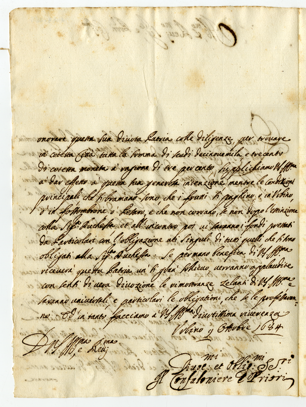 Chiedono a monsignor Albani di trovare in Roma scudi 19.300 in ragione del 3 per cento per estinguere il censo con la duchessa Aldobrandini