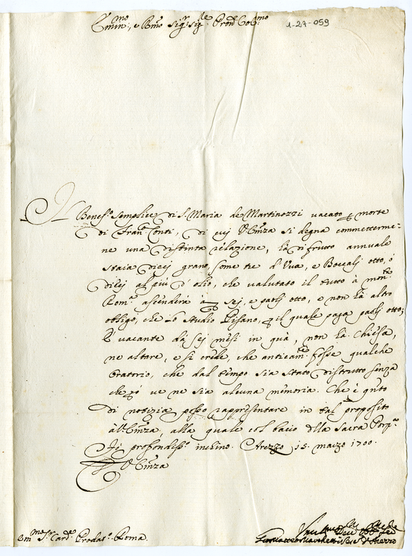 Lettera di Giovan Matteo Marchetti Vescovo di Arezzo al Cardinale Prodatario (1700 marzo 15)