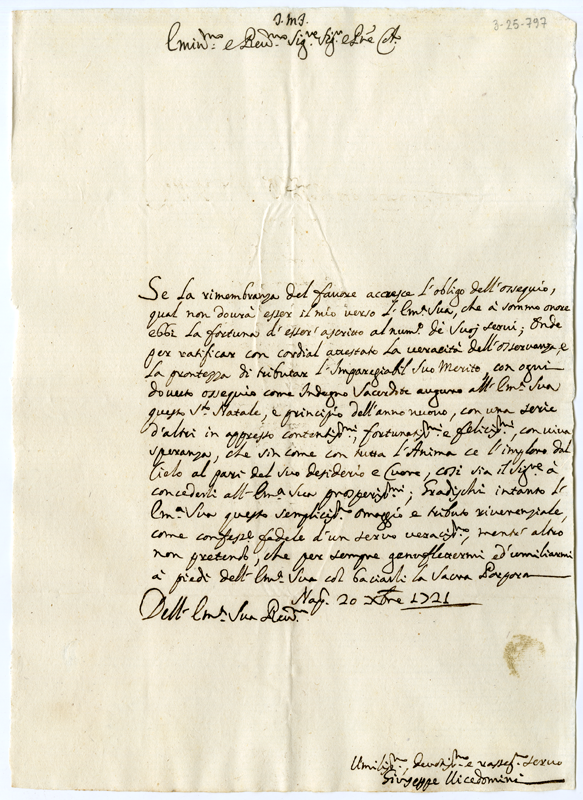 Lettera di Giuseppe Vicedomini al cardinale Annibale Albani (1721 dicembre 20)
