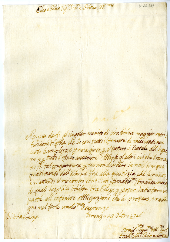 Lettera di Francesco Maria Riccardi al cardinale Annibale Albani (1716 dicembre 19)