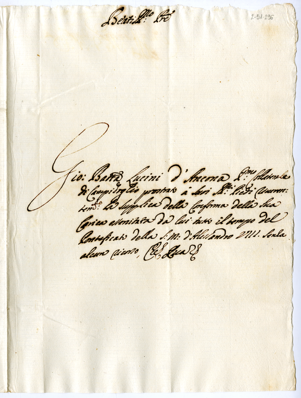 Lettera di Giovanni Battista Lucini di Ancona a papa Clemente XI (1700-1721)