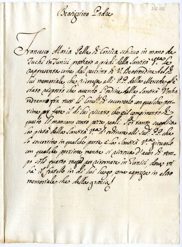 Trovandosi schiavo dei turchi in Tunisi chiede al pontefice di ordinare ai padri della Mercede di soccorrerlo