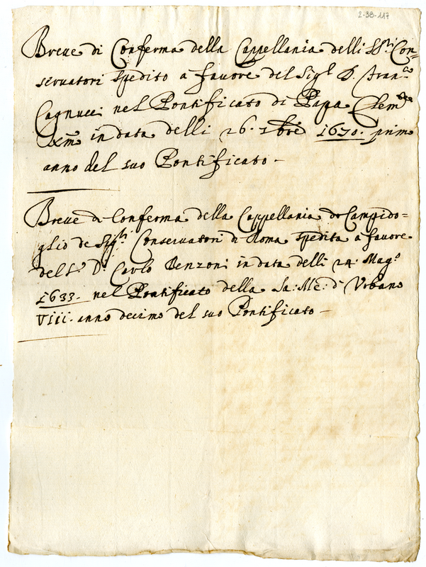 | dc.title | Conferma di due brevi a favore di Francesco Cagnucci e di Benzoni Carlo (1700-1721) | |