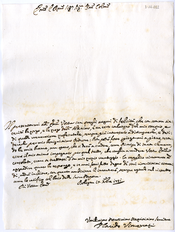 Lettera di Placido Vimercati al cardinale Annibale Albani (1731 dicembre 12)
