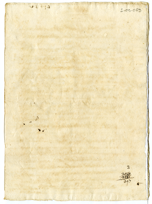 Signor Malatesta Albani. Li scudi mille ricevuti da Vostra Signoria da Monsignore Lomellino Commissario Generale di Nostro Signore sotto li 22 Aprile 1643 dovra pagarli al Sinor Conte S. Secondo è à chi sarà mandato da lui senza prenderne ricevuta che tale è mente nostra per il buon ....... di Sua Santità data in Bologna li 30 Aprile 1643. Copia
