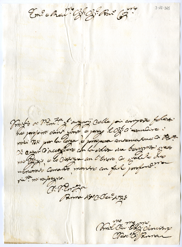 Lettera di Camillo vescovo di Parma al cardinale Annibale Albani (1725 dicembre 18)