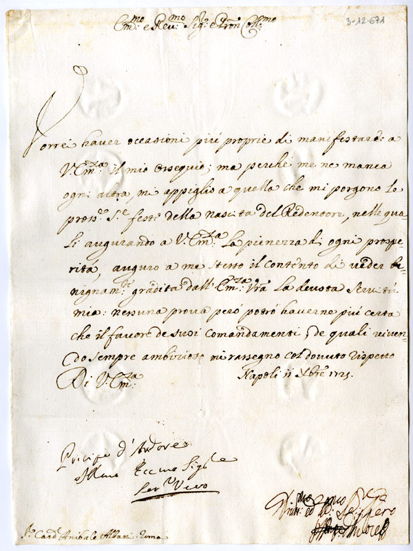 Lettera del principe d'Andore al cardinale Annibale Albani (1725 dicembre 11)
