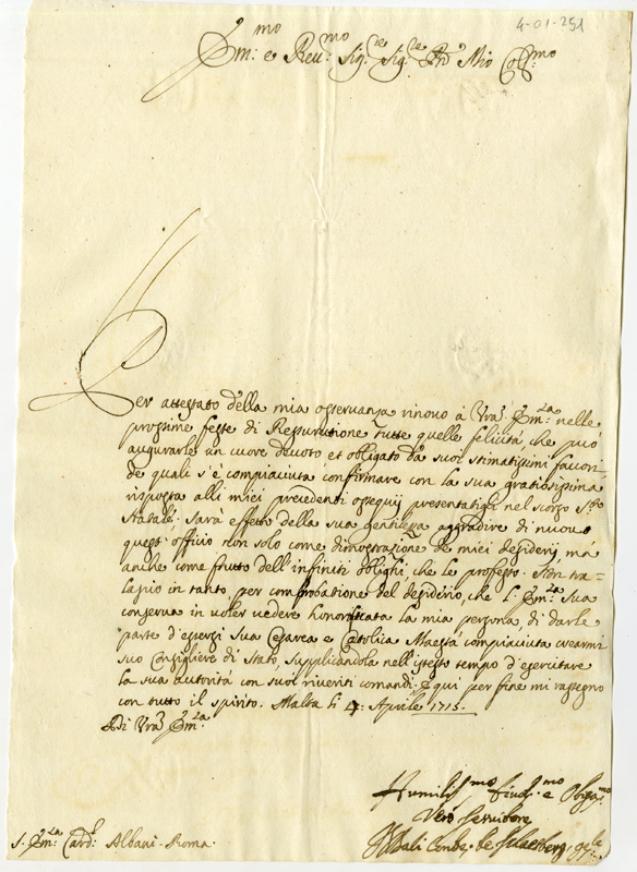 Lettera del Balì Conte Schaesberg al Cardinale Annibale Albani (1715 aprile 17)