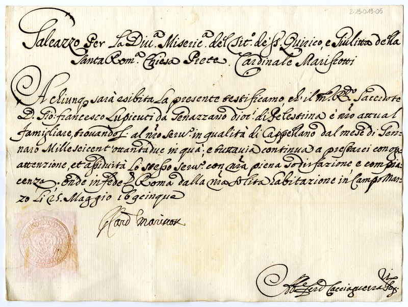 Attestato del cardinale Galeazzo Marescotti (1695 maggio 25)